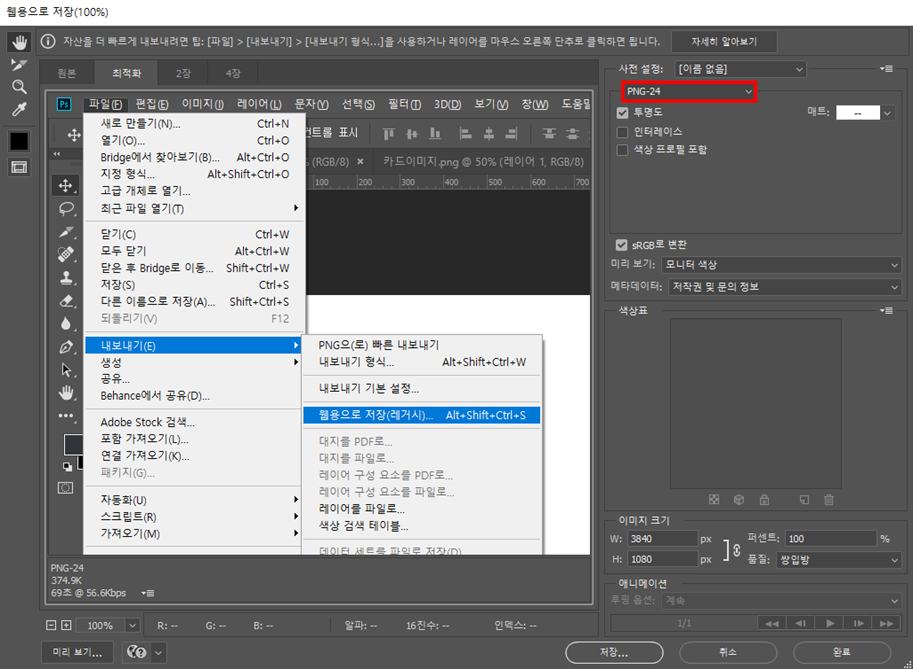 1. 파일 → 내보내기 → 웹용으로 저장을 클릭합니다. (단축키 Alt + Shift + Ctrl + S)